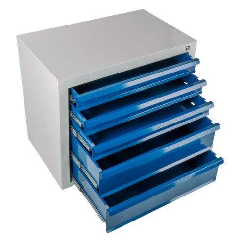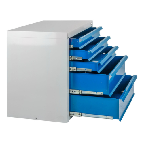constructie van staal. lade-uitrusting: laden nuttige afmetingen breedte x diepte 570 x 338 mm, nuttige hoogte = fronthoogte - 15 mm. draagvermogen per lade 40 kg. De volledig uittrekbare lade is goed toegankelijk en 100% bereikbaar tot in de verste hoek. laden Door de kogelgelagerde geleider is de uittrekbare lade gemakkelijk te openen en sluiten. met Uittrekstop. De stop voorkomt het onbedoeld volledig uittrekken van de lades. afsluitbaar met centrale vergrendeling. romp met slag- en krasvaste poedercoating in RAL7035 lichtgrijs. front met slag- en krasvaste poedercoating in RAL 5012 lichtblauw.
