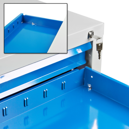 constructie van staal. lade-uitrusting: laden nuttige afmetingen breedte x diepte 570 x 338 mm, nuttige hoogte = fronthoogte - 15 mm. draagvermogen per lade 40 kg. De volledig uittrekbare lade is goed toegankelijk en 100% bereikbaar tot in de verste hoek. Door de kogelgelagerde geleider is de uittrekbare lade gemakkelijk te openen en sluiten. met Uittrekstop. De stop voorkomt het onbedoeld volledig uittrekken van de lades. afsluitbaar met centrale vergrendeling. romp met slag- en krasvaste poedercoating in RAL7035 lichtgrijs. front met slag- en krasvaste poedercoating in RAL 5012 lichtblauw.