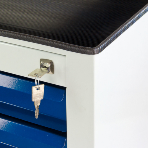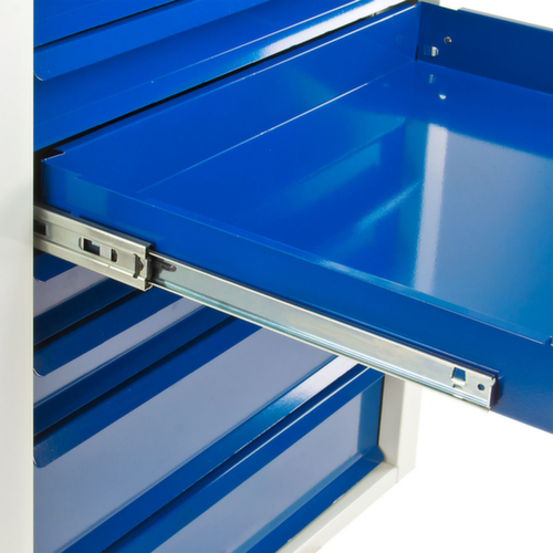 constructie van staal. lade-uitrusting: nuttige afmetingen lade breedte x diepte 570 x 405 mm. draagvermogen per lade 30 kg. De volledig uittrekbare lade is goed toegankelijk en 100% bereikbaar tot in de verste hoek. Door de kogelgelagerde geleider is de uittrekbare lade gemakkelijk te openen en sluiten. met Uittrekstop. De stop voorkomt het onbedoeld volledig uittrekken van de lades. afsluitbaar met centrale vergrendeling. romp met slag- en krasvaste poedercoating in RAL7035 lichtgrijs. front met slag- en krasvaste poedercoating in RAL 5012 lichtblauw. De opbergruimte is voorzien van een rubberen mat. De antislipmat voorkomt dat voorwerpen gemakkelijk van de kast rollen of vallen.