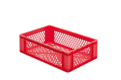 maten afgestemd op europallet. van breukvast polypropyleen in rood. Wanden doorbroken, bodem doorbroken. Meervoudig stapelbaar. geschikt voor levensmiddelen. Geschikt voor rollenbanen. Temperatuurbestendig -20 °C tot +80 °C. Geschikt voor verschillende stoffen, gelieve aan te vragen.