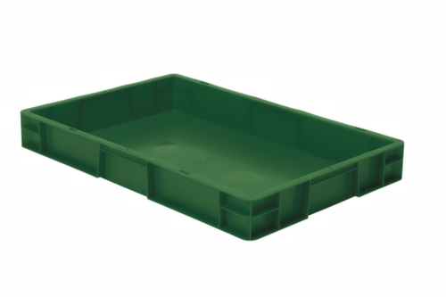 maten afgestemd op europallet. van breukvast polypropyleen in groen. Wanden gesloten, bodem gesloten. Meervoudig stapelbaar. geschikt voor levensmiddelen. Geschikt voor rollenbanen. Temperatuurbestendig -20 °C tot +80 °C.