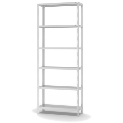 de belangrijkste maten van de hofe magazijnstelling in één oogopslag:6 niveaus met Stalen bodem. 3-voudige veiligheidsrand van 40 mm hoog en gesloten hoeken zorgt voor hoge stabiliteit en bescherming tegen verwondingen. vakhoogtes zijn afhankelijk van het doel en uw behoeften verstelbaar in stappen van 25 mm. gebruik eenzijdig - ontworpen voor plaatsing tegen een wand. constructie van staal, staanders verzinkt met kunststof coating in RAL7035 lichtgrijs, niveaus verzinkt met kunststof coating in RAL7035 lichtgrijs.