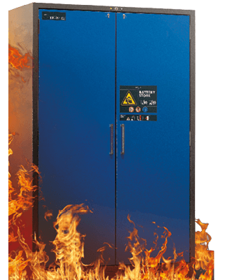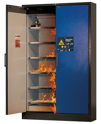 zijn onze kasten voor de opslag van lithium-ion-accu's/-batterijen van het zogenaamde type 90-model en dus brandbestendig conform EN 14470-1.