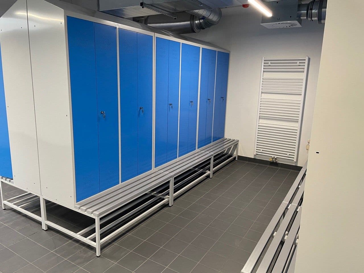 91 Garderobekasten met 4 vakken voor 182 MA in speciale uitvoering: met schuin dak, zitbank, sluitsysteem en binneninrichting.