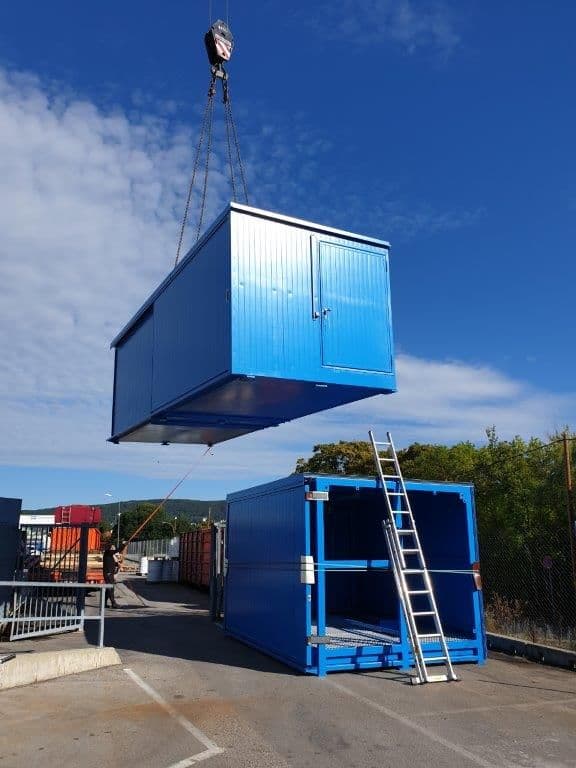 LaCont waterbeschermingscompartiment container, opvangvolume 6 x 550 liter B x D x H 12.200 x 2.910 x 2.800 mm. Comfortabel en functioneel uitgerust met: Ventilatorkachel, LED-verlichting, schakelkast, oprijplaat en een kleine stelling voor kleinemballage.
