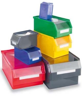 Net als laden kunnen kleine onderdelenbakken worden gebruikt als opbergbakken met open voorzijde en als legborden. Ze maken een gemakkelijke toegang tot de inhoud mogelijk en kunnen verder worden onderverdeeld met behulp van tussenschotten. Om vervuiling te voorkomen, kan worden gekozen voor bijpassende stofhoezen of voor een scharnierend box-magazijn, dat verkrijgbaar is in verschillende uitvoeringen zoals een trolley.
