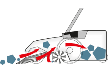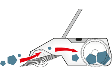 Twee contra-roterende borstels grijpen het vuil aan de voorkant van de machine en duwen het rechtstreeks in de vuilcontainer. Het puin wordt dus niet overreden en weggeduwd.
