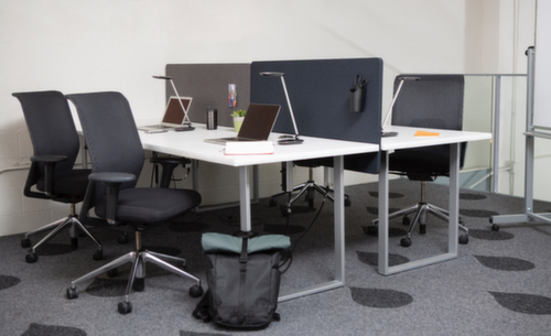 De belangrijkste maten van de LUXOR akoestische absorbers RECLAIM in één oogopslag:opstelling: Ter bevestiging aan de tafel met behulp van klemmen. wand van van tot 100% gerecyclede PET-materialen, waarbij de kern voor 60% en het stoffen oppervlak voor 100% bestaat uit hergebruikte materialen, in leigrijs. oppervlak opprikbaar. scheidingswand draaibaar, zodat ophanging onder het bureaublad mogelijk is. Hierdoor is een functie als zichtscherm mogelijk, bijvoorbeeld om kabels te verbergen. Bovendien biedt het extra privacy door het zicht op de benen te blokkeren. scheidingswand geluidabsorberend - voor een betere akoestiek. achterzijde voorzien van 3 voorgeboorde montagegaten voor een individuele aanpassing van de privacy.