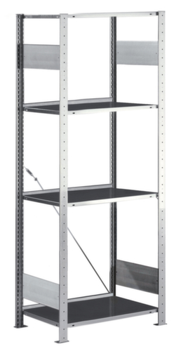 de belangrijkste maten van de META magazijnstelling in één oogopslag:4 niveaus met Stalen bodem. niveaus met aanslagrand om te voorkomen dat goederen eruit vallen en veiligheidsrand ter bescherming tegen verwondingen. opstelhoek recht. gebruik eenzijdig - ontworpen voor plaatsing tegen een wand. Hoge stabiliteit door diagonaalschoren. constructie van staal, staanders met corrosiebeschermende zinklaag, niveaus met corrosiebeschermende zinklaag.