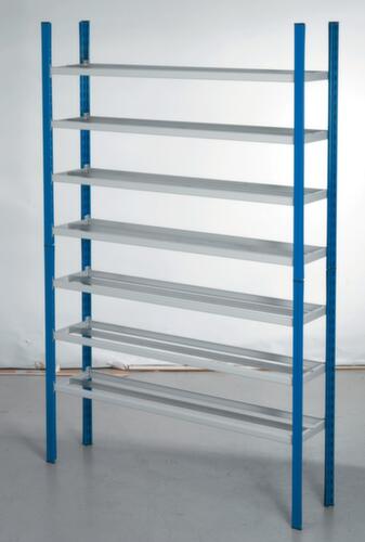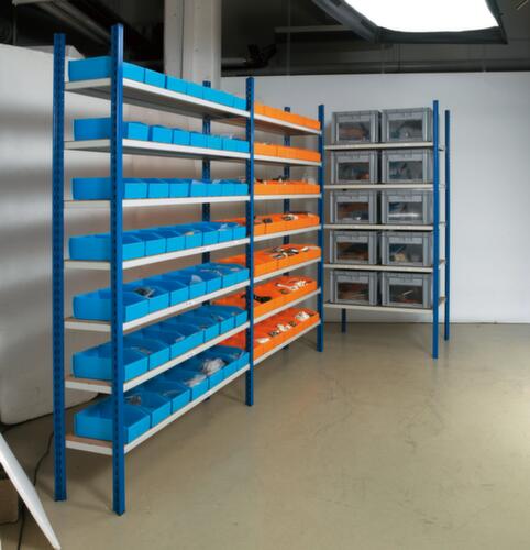 de belangrijkste maten van de bakkenstelling in één oogopslag:overzichtelijke onderdelenopslag op 7 niveaus met roostervloer en 50 bakken. vouwbaar en bestand tegen water, smeermiddelen en chemicaliën. vakhoogtes zijn afhankelijk van het doel en uw behoeften verstelbaar in stappen van 40 mm. gebruik eenzijdig - ontworpen voor plaatsing tegen een wand. constructie van staal. staanders met duurzame en sterke epoxylak in blauw. niveaus met duurzame en sterke epoxylak in grijs.