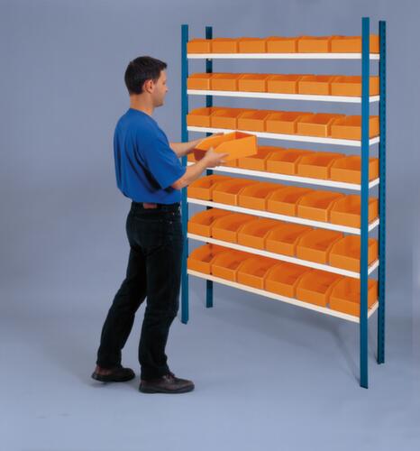 de belangrijkste maten van de bakkenstelling in één oogopslag:overzichtelijke onderdelenopslag op 7 niveaus met roostervloer en 50 bakken. vouwbaar en bestand tegen water, smeermiddelen en chemicaliën. vakhoogtes zijn afhankelijk van het doel en uw behoeften verstelbaar in stappen van 40 mm. gebruik eenzijdig - ontworpen voor plaatsing tegen een wand. constructie van staal. staanders met duurzame en sterke epoxylak in blauw. niveaus met duurzame en sterke epoxylak in grijs.