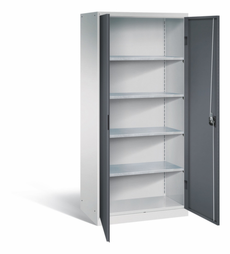 De romp van de kast is gemaakt van staal en stevig gelast. Dit maakt de constructie zeer robuust en sterk en dus duurzamer. Omdat de hoeken en randen van de romp gelast zijn, is de kast goed afgedicht en dus beter beschermd tegen stof, vocht en vuil dan bij een schroefconstructie. Bovendien is regelmatig onderhoud en nastellen niet nodig. Zeer flexibele binneninrichting door verstelbare vakhoogte per 17 mm. uitgerust met 4 legborden. dubbele vleugeldeur. afsluitbaar met cilinderslot met 2-puntsvergrendeling. deuren gemeenschappelijk afsluitbaar. De sokkel onder de kast zorgt ervoor dat het gewicht van de kast gelijkmatig over de vloer wordt verdeeld. Hierdoor staat de kast stabieler en kan hij zwaardere lasten dragen dan een kast met voeten. En omdat er geen vuil, stof en vocht onder kan komen, hoeft er onder de kast niet te worden schoongemaakt.