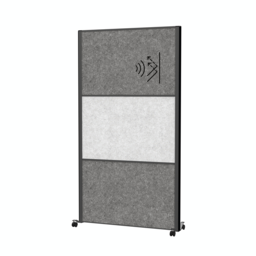 Voor opstelling op de vloer. wand van polyestervlies (als optimaal isolatiemateriaal) in donkergrijs/lichtgrijs (opgedeeld in 2 wanden in donkergrijs en 1 wand in lichtgrijs). oppervlak opprikbaar. frame van aluminium in antraciet. onderbouw met wielen met rem. Op elk moment uitbreidbaar: meerdere scheidingswanden kunnen zonder kieren aan elkaar worden gekoppeld met klittenband.