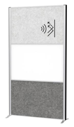 Voor opstelling op de vloer. wand van polyestervlies (akoestische wanden) en plaatstaal (whiteboard) in lichtgrijs/donkergrijs/wit (opgedeeld in 1 wand in lichtgrijs, 1 wand in donkergrijs en whiteboard in wit). oppervlak opprikbaar en magnetisch. frame van aluminium in zilverkleurig. onderbouw met standvoet met stelvoet om oneffen vloeren te compenseren. Op elk moment uitbreidbaar: meerdere scheidingswanden kunnen zonder kieren aan elkaar worden gekoppeld met klittenband.