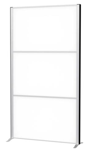 Voor opstelling op de vloer. wand van plaatstaal in wit. oppervlak magnetisch, beschrijfbaar en droog afneembaar voor herhaaldelijk gebruik. Het bord is kostenbesparend, omdat het zonder papier kan worden gebruikt. frame van aluminium in zilverkleurig. onderbouw met standvoet met stelvoet om oneffen vloeren te compenseren. Op elk moment uitbreidbaar: meerdere scheidingswanden kunnen zonder kieren aan elkaar worden gekoppeld met klittenband.