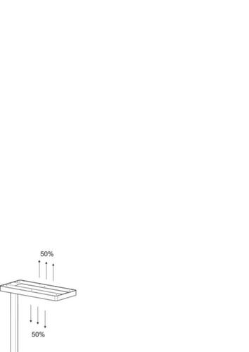 lampenkop met ca. 50% straling naar boven en onder en diffusor voor geringe schaduwwerking. hoogte 1960 mm, lampenkop lengte x breedte 610 x 280 mm, voet lengte x breedte 450 x 300 mm, met uitsparing voor tafelpoot. van aluminium in wit. kabel 2,5 m lang.
