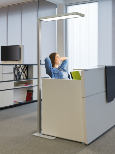 lampenkop met diffusor voor geringe schaduwwerking. uitgerust met aan/uit-schakelaar, kabel met stekker. hoogte 1960 mm, lampenkop lengte x breedte 792 x 240 mm, voet lengte x breedte 455 x 270 mm, met uitsparing voor tafelpoot. van aluminium in zilverkleurig. kabel 2,5 m lang.