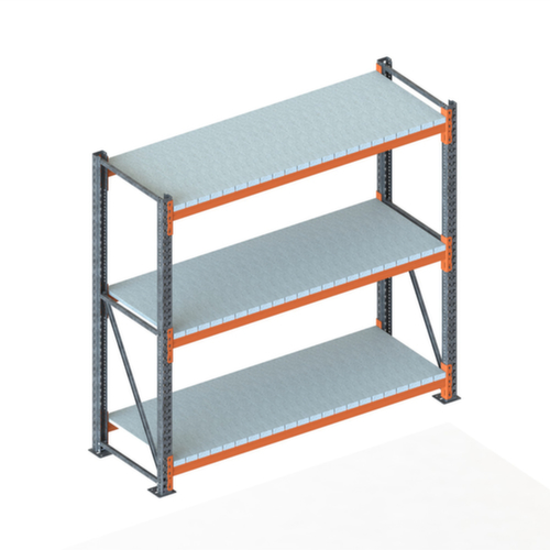 de belangrijkste maten van de META breedvakstelling Multipal S in één oogopslag:3 niveaus met stalen panelen. vakhoogtes zijn afhankelijk van het doel en uw behoeften verstelbaar in stappen van 50 mm. gebruik eenzijdig - ontworpen voor plaatsing tegen een wand. constructie van staal. staanders met corrosiebeschermende zinklaag. niveaus met corrosiebeschermende zinklaag. traversen met slag- en krasvaste poedercoating in RAL2001 roodoranje.