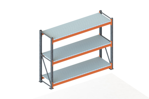 de belangrijkste maten van de META breedvakstelling Multipal S in één oogopslag:3 niveaus met stalen panelen. vakhoogtes zijn afhankelijk van het doel en uw behoeften verstelbaar in stappen van 50 mm. gebruik eenzijdig - ontworpen voor plaatsing tegen een wand. constructie van staal. staanders met corrosiebeschermende zinklaag. niveaus met corrosiebeschermende zinklaag. traversen met slag- en krasvaste poedercoating in RAL2001 roodoranje.
