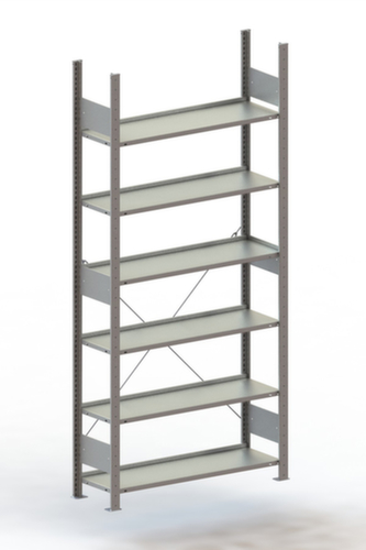 de belangrijkste maten van de META magazijnstelling in één oogopslag:6 niveaus met Stalen bodem. niveaus met aanslagrand om te voorkomen dat goederen eruit vallen en veiligheidsrand ter bescherming tegen verwondingen. opstelhoek recht. gebruik eenzijdig - ontworpen voor plaatsing tegen een wand. Hoge stabiliteit door diagonaalschoren. constructie van staal, staanders met corrosiebeschermende zinklaag, niveaus met corrosiebeschermende zinklaag.