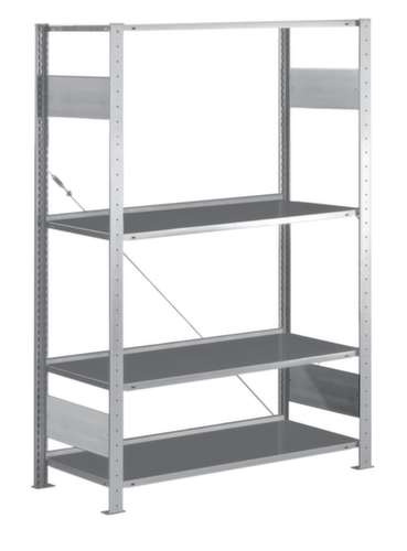 de belangrijkste maten van de META magazijnstelling in één oogopslag:4 niveaus met legbord. niveaus met aanslagrand om te voorkomen dat goederen eruit vallen en veiligheidsrand ter bescherming tegen verwondingen. vakhoogtes zijn afhankelijk van het doel en uw behoeften verstelbaar in stappen van 25 mm. opstelhoek recht. gebruik eenzijdig - ontworpen voor plaatsing tegen een wand. Hoge stabiliteit door diagonaalschoren. constructie van staal, staanders verzinkt met slag- en krasbestendige poedercoating in RAL7035 lichtgrijs, niveaus verzinkt met slag- en krasbestendige poedercoating in RAL7035 lichtgrijs.
