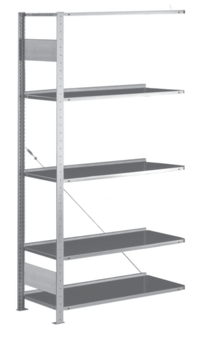 de belangrijkste maten van de META magazijnstelling in één oogopslag:5 niveaus met legbord. niveaus met aanslagrand om te voorkomen dat goederen eruit vallen en veiligheidsrand ter bescherming tegen verwondingen. vakhoogtes zijn afhankelijk van het doel en uw behoeften verstelbaar in stappen van 25 mm. opstelhoek recht. gebruik eenzijdig - ontworpen voor plaatsing tegen een wand. Hoge stabiliteit door diagonaalschoren. constructie van staal, staanders verzinkt met slag- en krasbestendige poedercoating in RAL7035 lichtgrijs, niveaus verzinkt met slag- en krasbestendige poedercoating in RAL7035 lichtgrijs.