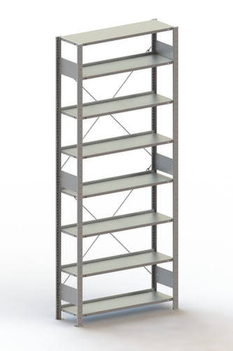 De belangrijkste maten van de META van de META inhaakstelling in één oogopslag:Op 8 niveau(s) met Stalen bodem / 7 ordnerhoogtes kunt u dossiers, ordners en overig kantoormateriaal optimaal ordenen. niveaus met aanslagrand aan achterzijde om te voorkomen dat ordners eruit vallen. vakhoogtes zijn afhankelijk van het doel en uw behoeften verstelbaar in stappen van 25 mm. M-vormige langsdragers met 5-voudige afkanting zorgen voor hoge stabiliteit en bescherming tegen verwondingen. gebruik eenzijdig - ontworpen voor plaatsing tegen een wand. Hoge stabiliteit door diagonaalschoren. constructie van staal. staanders verzinkt met slag- en krasbestendige poedercoating in RAL7035 lichtgrijs. niveaus verzinkt met slag- en krasbestendige poedercoating in RAL7035 lichtgrijs.