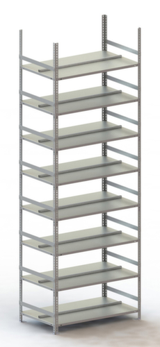De belangrijkste maten van de META dossierstelling in één oogopslag:Op 8 niveau(s) met legborden van hoogwaardig plaatstaal / 8 ordnerhoogtes kunt u dossiers, ordners en overig kantoormateriaal optimaal ordenen. vakhoogtes zijn afhankelijk van het doel en uw behoeften verstelbaar in stappen van 25 mm. niveaus met aanslagrand aan achterzijde om te voorkomen dat ordners eruit vallen. M-vormige langsdragers met 5-voudige afkanting zorgen voor hoge stabiliteit en bescherming tegen verwondingen. gebruik tweezijdig - flexibele opstelling vrijstaand in de ruimte mogelijk. constructie van staal, staanders verzinkt met slag- en krasbestendige poedercoating in RAL7035 lichtgrijs, niveaus verzinkt met slag- en krasbestendige poedercoating in RAL7035 lichtgrijs.