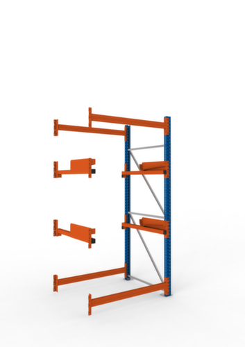 de belangrijkste maten van de META kabelhaspelstelling MULTIPAL in één oogopslag:2 niveaus met kabelhaspelsteun. niveaus met rails aan de bomen voor het invoerden van de haspelhouder. Zeer stabiel dankzij diagonaal- en horizontaalschoren. constructie van staal, staanders met slijtvaste kunststof coating in RAL5010 gentiaanblauw, niveaus met slijtvaste kunststof coating in RAL2001 roodoranje.