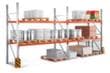 2 stellingvelden met elk 2 niveau(s) met traversen. vakhoogtes zijn afhankelijk van het doel en uw behoeften verstelbaar in stappen van 50 mm. 18 opslagplaatsen (incl. vloeropslag). opslag in de lengte. draagvermogen per pallet 800 kg. hoge stabiliteit door gesloten kokerprofielen. gebruik eenzijdig - ontworpen voor plaatsing tegen een wand. staanders met corrosiebeschermende zinklaag. traversen met slag- en krasvaste poedercoating in RAL2001 roodoranje.