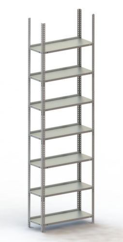 de belangrijkste maten van de META magazijnstelling in één oogopslag:7 niveaus met Stalen bodem. niveaus met aanslagrand om te voorkomen dat goederen eruit vallen en veiligheidsrand ter bescherming tegen verwondingen. gebruik eenzijdig - ontworpen voor plaatsing tegen een wand. zeer stabiel in lengte- en diepterichting. constructie van staal, staanders verzinkt met slag- en krasbestendige poedercoating in RAL7035 lichtgrijs, niveaus verzinkt met slag- en krasbestendige poedercoating in RAL7035 lichtgrijs.