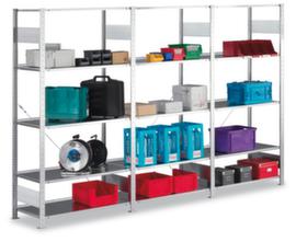 Voor uw veiligheid: volgens DIN EN 15635 moeten legbordstellingen die 4 keer zo hoog zijn als de stellingdiepte (verhouding 4:1) aan de vloer worden bevestigd en geborgd. De aangegeven vaklasten gelden bij een gelijkmatig verdeelde belasting. extra legborden/niveaus zijn leverbaar als accessoire en zijn uit te breiden tot de maximale veldlast.
