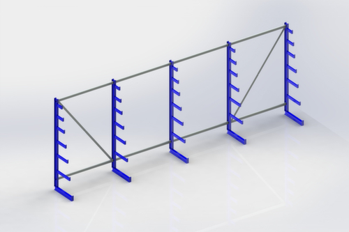 De belangrijkste maten van de META van de META draagarmstelling Atlas ST Atlas ST in één oogopslag:gebruik eenzijdig - ontworpen voor plaatsing tegen een wand. 7 opslagniveaus. 6 niveaus met Kraagarm, met afrolbeveiliging. draagvermogen per arm 150 kg. Armen van verschillende lengte in kegelvorm, recht uitgericht. nuttige diepte 150 mm. constructie van staal. staanders gezandstraald met poedercoating in RAL5010 gentiaanblauw. draagarmen gezandstraald met poedercoating in RAL5010 gentiaanblauw.