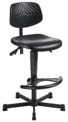 "longDescription": "<h2>Werkstoel</h2><br><h3>Zitting en rugleuning:</h3><ul><li>Gemaakt van gemakkelijk te reinigen PU-schuim</li></ul><br><h3>Zittechniek:</h3><ul><li>hoogteverstelling van zitting m.b.v. gasveer</li><li>met zithellingverstelling</li><li>zithoek rugleuning verstelbaar</li><li>rugleuning in hoogte verstelbaar en pendelend gelagerd</li></ul><br><h3>Voetkruis:</h3><ul><li>met kunststof vloerglijders</li><li>van staal, rechthoekige buis 40 x 20 x 2 mm</li><li>met epoxyharscoating</li></ul><br><h3>Voetensteun:</h3><ul><li>individueel in hoogte verstelbaar</li><li>niet draaibaar</li></ul><br>5 jaar garantie<br><ul><li>voldoet aan DIN 68877</li></ul>",