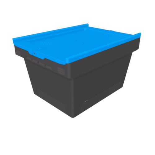 van polypropyleen regeneraat. De opgeslagen goederen zijn door de gesloten wanden beschermd tegen stof en de bak is gemakkelijk te reinigen. legbord gesloten. tweedelig klapdeksel in blauw. deksel van Nieuw granulaat. Meervoudig stapelbaar. Met open deksel in elkaar stapelbaar.