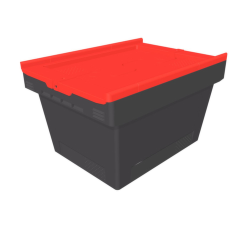 van polypropyleen regeneraat. De opgeslagen goederen zijn door de gesloten wanden beschermd tegen stof en de bak is gemakkelijk te reinigen. legbord gesloten. tweedelig klapdeksel in rood. deksel van Nieuw granulaat. Meervoudig stapelbaar. Met open deksel in elkaar stapelbaar.