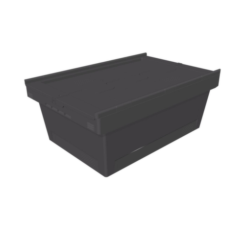 van polypropyleen regeneraat. De opgeslagen goederen zijn door de gesloten wanden beschermd tegen stof en de bak is gemakkelijk te reinigen. legbord gesloten. tweedelig klapdeksel in zwart. deksel van Nieuw granulaat. Meervoudig stapelbaar. Met open deksel in elkaar stapelbaar.