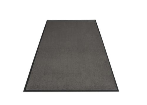 De belangrijkste afmetingen in één oogopslag:loopvlak van polypropyleen in donkergrijs/grijs. rug van vinyl. oppervlak met gesloten oppervlak. bestendig tegen vuil en vocht. functies: antislip. Dankzij de 20 mm brede rand rondom ligt de mat snel vlak en stevig op elke vloer.