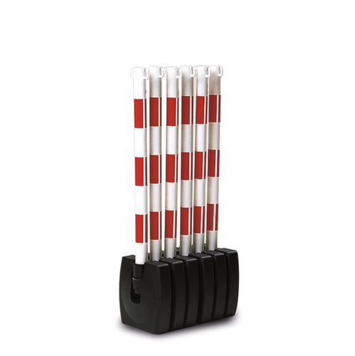 De belangrijkste afmetingen van het Moravia afzetsysteem GUARDA Flex in één oogopslag:Hoge flexibiliteit door inklapbare voet en 2 geïntegreerde kettinghaken aan de paal voor een snelle plaatsing. voet met verzwaring, omklapbaar. paal van kunststof in rood/wit. voet van kunststof in zwart.