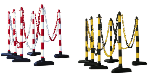 "longDescription": "<h2>Set kettingstaanders</h2><strong>complete mobiele set voor snel afzetten</strong><br><ul><li><strong>set bestaande uit:</strong> 6 kettingpalen, 10 m ketting, 10 verbindingsschakels, 10 inhanghaken</li><li>met geïntegreerde kettinghouder</li><li><strong>licht en ongevoelig</strong> - paal van kunststof</li></ul><br><h3>De keuze is aan jou:</h3><ul><li><strong>voor elk doel de juiste voet</strong> - driehoekig van kunststof met beton gevuld, rond van kunststof en vulbaar of vierkant van hard rubber</li></ul><br>De kettingstandaardset is perfect geschikt voor een eenvoudige en snelle mobiele afzetting. Met de meegeleverde 6 kettingstatieven, 10 m ketting, 10 verbindingsschakels en 10 haken kan elk gebied worden afgezet. Dankzij de hoogte van 870 mm is de barrière altijd duidelijk zichtbaar voor automobilisten en voetgangers. <br><br>De kunststof palen hebben een diameter van 40 mm en zijn verkrijgbaar in de kleurencombinaties rood/wit of geel/zwart, waardoor een extra signaalwerking ontstaat. Bovendien hebben de kettingsteunen een geïntegreerde kettinghouder. De stands moeten op een afstand van maximaal 2 m worden geplaatst. Afhankelijk van het beoogde gebruik, kunt u kiezen tussen verschillende voetontwerpen.<br>",