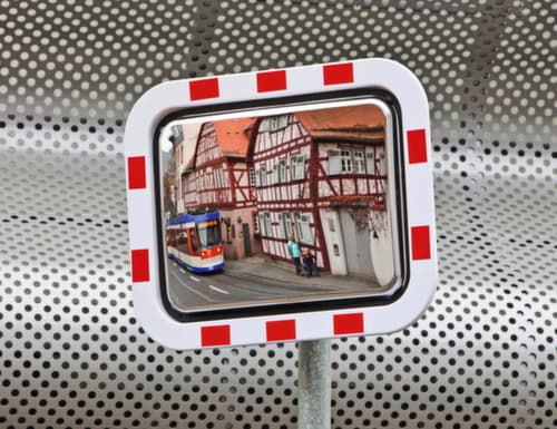 "metaDescription": "Moravia Verkeersspiegel - H x B 450 x 600 mm, spiegel RVS, lijst kunststof, met houder, wit/rood",