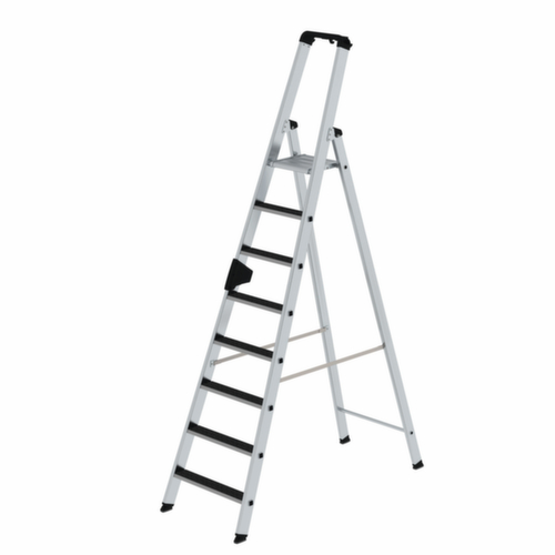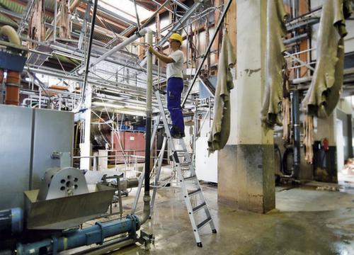 "longDescription": "<h2>Veiligheidstrap</h2><ul><li>Gemaakt van aluminium</li><li>Geflensde trap-rail verbindingen</li><li>Treden 80 mm diep</li><li>Trapafstand 235 mm</li><li>Ladderverbinding met 4-voudige schroefverbinding en grotere wanddikte</li><li>Stuuruiteinden met antislip nivello® ladderschoenen</li><li>Met ergonomische Ergo-Pad® gripzone</li><li>Klembeveiliging tegen onbedoeld openen tijdens transport</li></ul><br><h3>Eenzijdig:</h3><ul><li>Vanaf 7 treden met 2 hoge-sterkte perlon riemen als strooibescherming</li><li>Platform B x D 254 x 252 mm</li></ul><br><h3>Aan beide kanten:</h3><ul><li>2 hoge-sterkte perlon riemen om spreiding te voorkomen</li><li>clip-step R13 loopvlak alleen tot de maximaal begaanbare trede volgens DIN EN 131</li></ul><br>De trapladder van Günzburger Steigtechnik van robuust aluminium kan op vele manieren worden gebruikt en veiligheid staat bij dit model voorop. Hij is verkrijgbaar in verschillende versies en kan aan één of beide zijden worden beklommen. De trap-rail verbinding is geflensd en de ladderverbinding heeft een drievoudige klinknagel en een grotere wanddikte. Beide zorgen voor een betere bescherming van de gebruiker van de ladder, stabiliteit en duurzaamheid.<br><br>De R13 antisliptreden maken dit model perfect voor natte en/of geoliede werkplekken omdat het risico op uitglijden wordt beperkt, zelfs met natte of geoliede schoenzolen. Om te voorkomen dat de hele trap wegglijdt tijdens het werken, zijn de uiteinden van de ladder voorzien van antislipvoetdoppen. Alle varianten hebben een ergonomische grijpzone met een klemmechanisme dat beschermt tegen het onbedoeld openen van de ladder tijdens het transport. Het conische ontwerp bevordert ook een hoge stabiliteit. De ladder, die aan één kant kan worden beklommen, bevat twee zeer sterke singelbanden als anti-spreidbeveiliging van een variant met zeven treden naar boven. Bovendien is het een voor Nederland goedgekeurde versie in overeenstemming met de Warenwet. <br><br>In het geval van het model dat aan beide zijden kan worden beklommen, zijn de singelbanden reeds aanwezig als anti-spreidmiddel vanaf de kleinste ladder. Opgelet: de Nederlandse versie moet op verzoek worden besteld.<br><br><strong>Goed om te weten!</strong><br>DGUV 208-016 (voorheen BGI 694) geeft een toelichting op de bepalingen van de verordening inzake de veiligheid en de gezondheid op het werk (BetrSichV) betreffende het ter beschikking stellen en het gebruik van draagbare ladders en trappen. <br>DIN EN 131 bestaat uit 4 delen, die betrekking hebben op benamingen, typen, functionele afmetingen, eisen, testen, aanduidingen van ladders, veiligheidsinstructies en gebruikersinformatie.<br>",