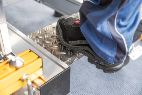 De belangrijkste maten van de MUNK steiger Desk-Surfer in één oogopslag:veilig in gebruik door leuning aan 3 zijden. uitgerust met veiligheidsband om openingen in leuningen af te sluiten voor bescherming rondom. frame in hoogte verstelbaar door optioneel insteekdeel. met 4 zwenkwielen voor eenvoudig manoeuvreren. Voor stationair gebruik zijn de wielen uitgerust met een rem. wiel Ø 125 mm. gebruik eenzijdig. platformconstructie van aluminium met slag- en krasvaste poedercoating. aluminiumsteiger met slag- en krasvaste poedercoating in zilverkleurig. platform belastbaar tot 150 kg. opbouw snel en zonder gereedschap dankzij vastklinkende scharnieren en steekverbindingen. Leveringstoestand gedemonteerd - eenvoudig zelf te monteren.