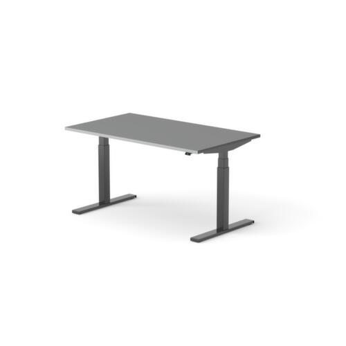 blad van spaanplaat met onderhoudsvriendelijke melamineharscoating in decor MS Slate. plaatvorm rechthoekig. T-voetonderstel in RAL9005 gitzwart. hoogteverstelling door elektromotor met handschakelaar. met eurostekker.