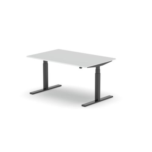 blad van spaanplaat met onderhoudsvriendelijke melamineharscoating in decor BI White. plaatvorm rechthoekig. T-voetonderstel in RAL9005 gitzwart. hoogteverstelling door elektromotor met handschakelaar. met eurostekker.