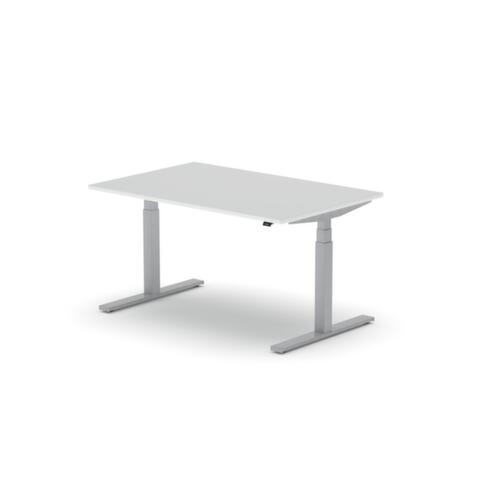blad van spaanplaat met onderhoudsvriendelijke melamineharscoating in decor BI White. plaatvorm rechthoekig. T-voetonderstel in RAL9006 blank aluminiumkleurig. hoogteverstelling door elektromotor met handschakelaar en display. functies: Opslaan en automatisch oproepen van geprogrammeerde tafelhoogtes dankzij memoryfunctie. met eurostekker.