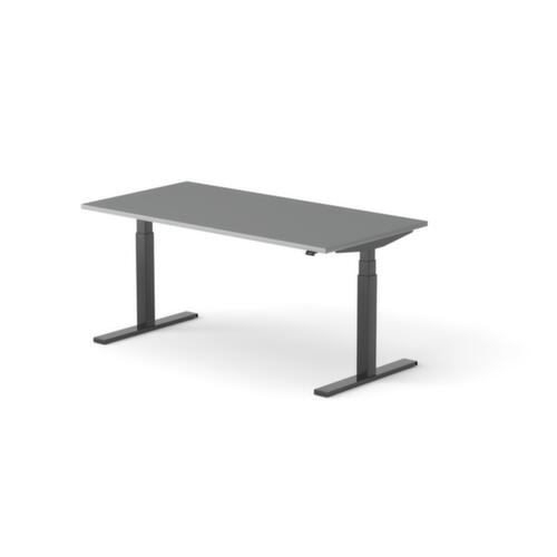 blad van spaanplaat met onderhoudsvriendelijke melamineharscoating in decor MS Slate. plaatvorm rechthoekig. T-voetonderstel in RAL9005 gitzwart. hoogteverstelling door elektromotor met handschakelaar. met eurostekker.