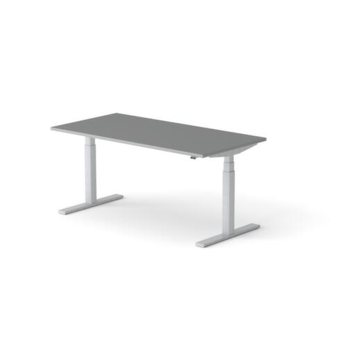 blad van spaanplaat met onderhoudsvriendelijke melamineharscoating in decor MS Slate. plaatvorm rechthoekig. T-voetonderstel in RAL9006 blank aluminiumkleurig. hoogteverstelling door elektromotor met handschakelaar en display. functies: Opslaan en automatisch oproepen van geprogrammeerde tafelhoogtes dankzij memoryfunctie. met eurostekker.