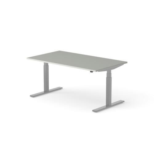 blad van spaanplaat met onderhoudsvriendelijke melamineharscoating in decor MP Platinum. plaatvorm rechthoekig. T-voetonderstel in RAL9006 blank aluminiumkleurig. hoogteverstelling door elektromotor met handschakelaar en display. functies: Opslaan en automatisch oproepen van geprogrammeerde tafelhoogtes dankzij memoryfunctie. met eurostekker.