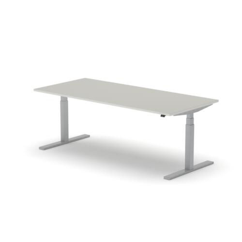 blad van spaanplaat met onderhoudsvriendelijke melamineharscoating in decor MB White Grey. plaatvorm rechthoekig. T-voetonderstel in RAL9006 blank aluminiumkleurig. hoogteverstelling door elektromotor met handschakelaar. met eurostekker.